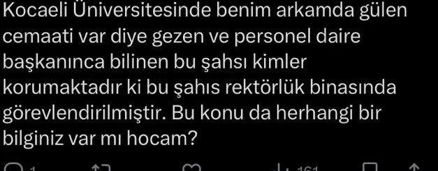 Eşim, FETÖ’cü olduğu bilindiği halde, bu tehditleri kurum içinde yapmasına rağmen Sağlık Kültür Daire Başkanlığı’ndan alınıp rektörlük binasında, Strateji Daire Başkanlığı’nda görevlendiriliyor. Ve hakkında herhangi bir işlem yapılmıyor.
