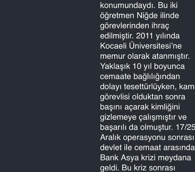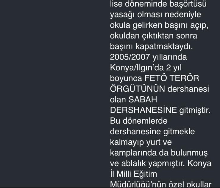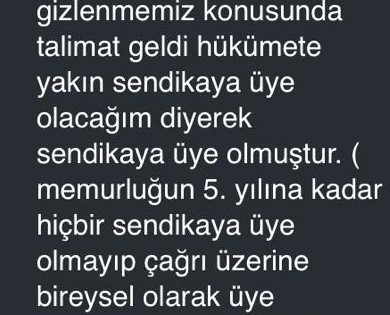 Eşim Aktif Sen’e hiç üye olmadı. Mesajın ardından Eğitim Bir-Sen’e geçti. Sosyal medyada instagram kullanırdı ama hiçbir zaman hiçbir siyasi bir şey paylaşmaz, paylaşmadı. Kimliğini belli etmez. Cemaatin siyasetin aleyhine leyhine hiçbir şey paylaşmaz. Memuriyete başlarken, ‘Senin tesettürden çıkman gerekiyor. Cemaat kimliğini gizlemelisin’ diyorlar buraya atanırken. Evliliğimiz öncesi tesettürlü idi. Şu anda da başı açık.